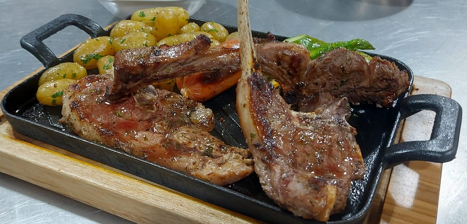 250 gr. de cordero y chorizo al carbón con papas salteadas, vegetales al grill y ensalada.
