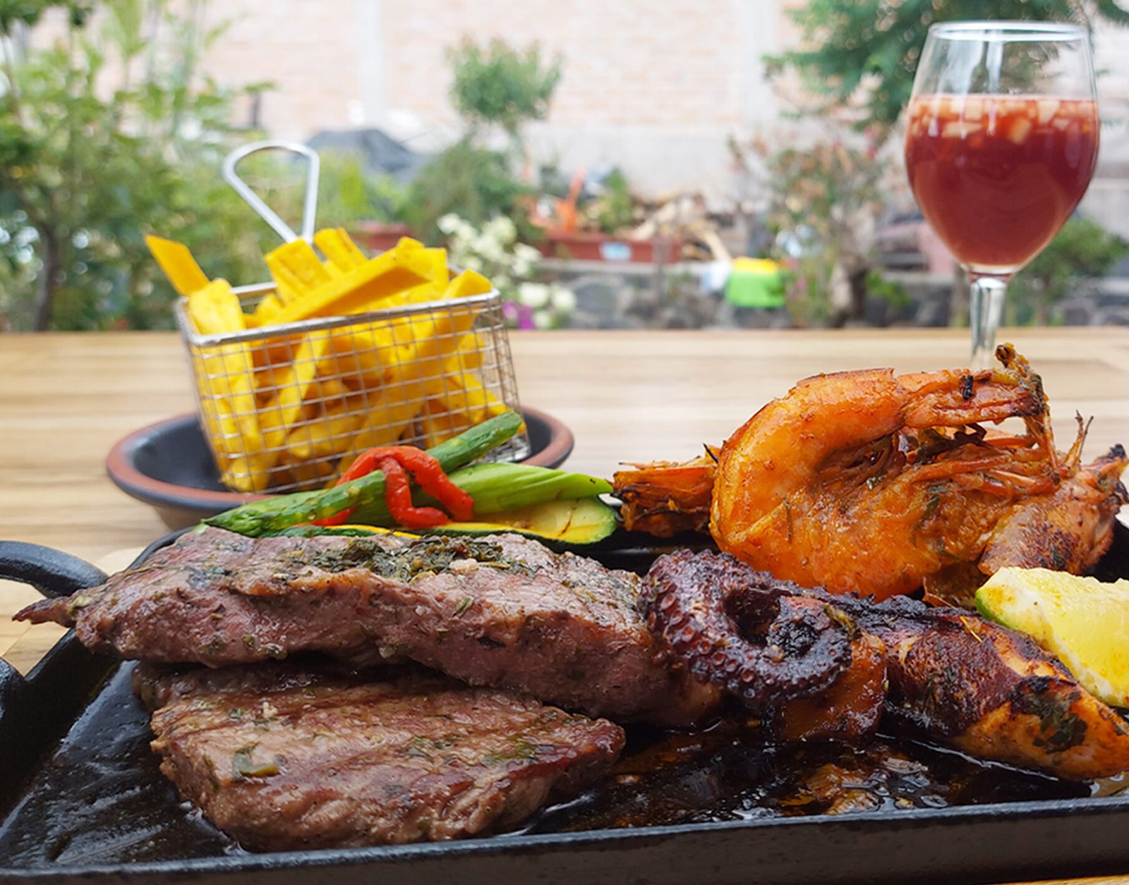 Langostinos, pulpo y lomo al carbón, acompañados de bastones de verde fritos y vegetales al grill.